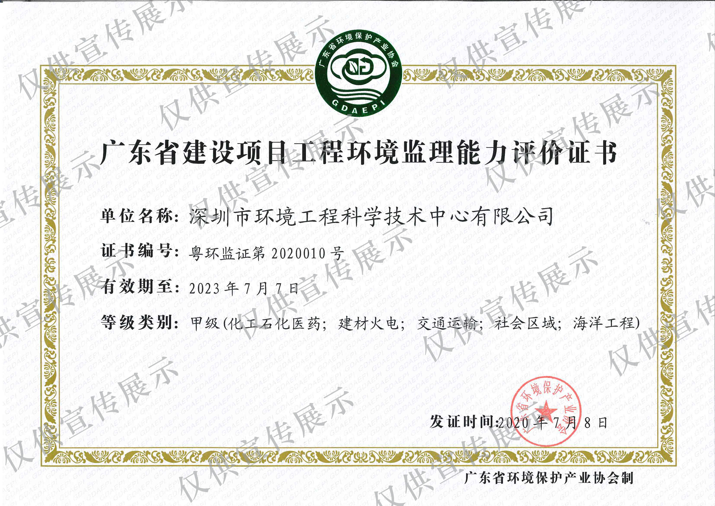• 廣東省建設項目工程環(huán)境監(jiān)理能力評價證書